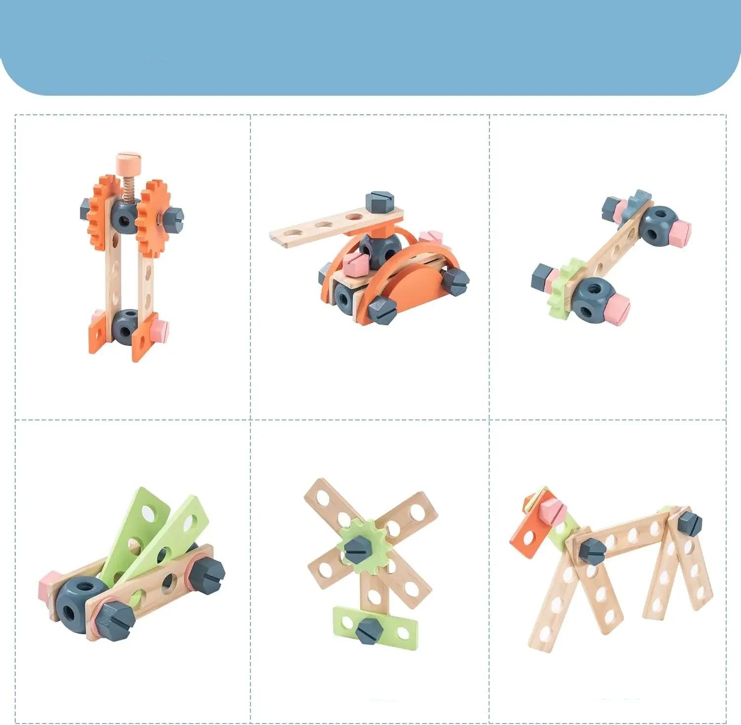Marteau, tournevis, clé, vis et pièces en bois : tout pour s’amuser comme un vrai bricoleur.